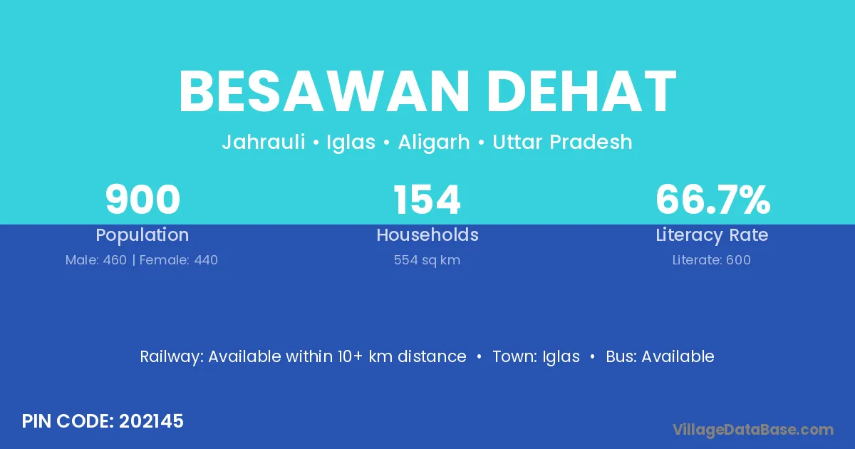 Besawan Dehat village has a total population of 900 people, of which 460 are males and 440 are females.