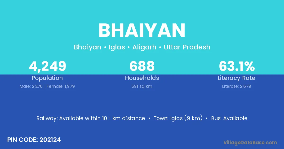Iglas (9 km) is the nearest town to Bhaiyan village for major economic activities and is located approximately 9 km away.