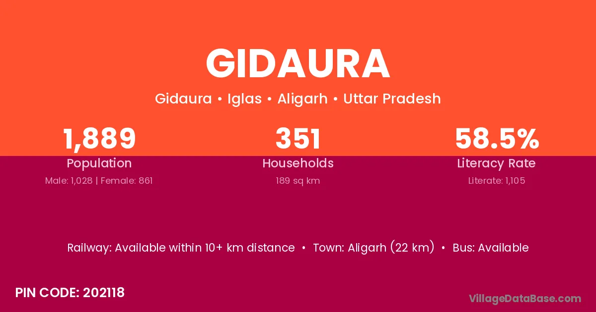 Aligarh (22 km) is the nearest town to Gidaura village for major economic activities and is located approximately 22 km away.