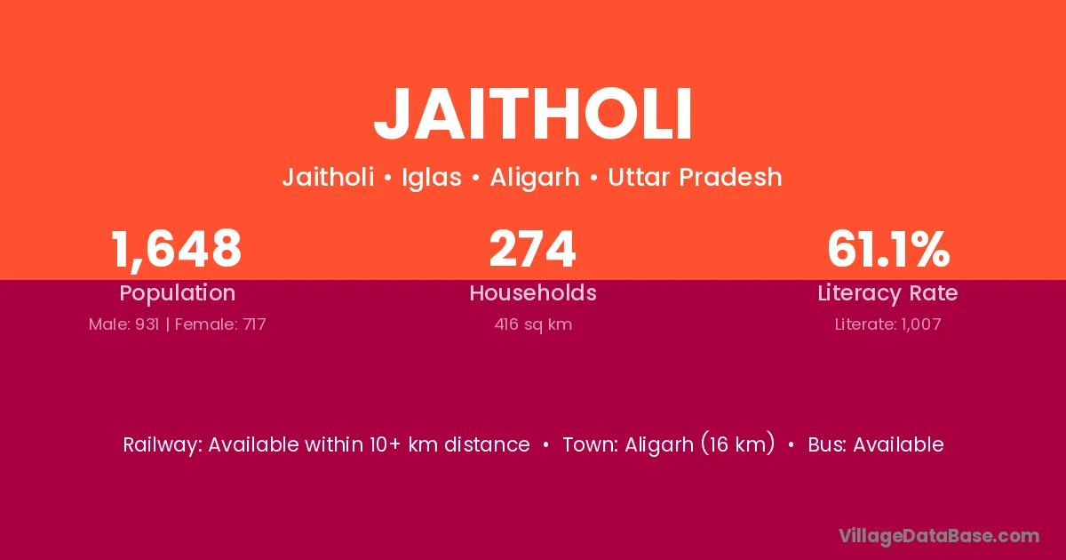 Aligarh (16 km) is the nearest town to Jaitholi village for major economic activities and is located approximately 16 km away.