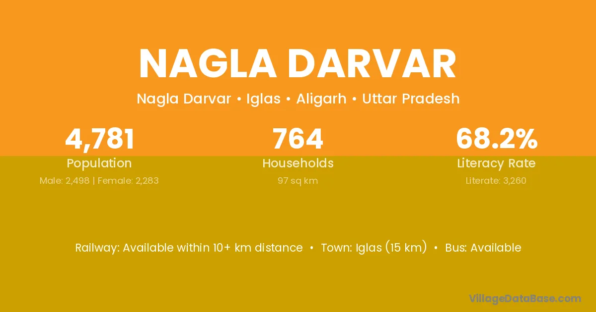 Iglas (15 km) is the nearest town to Nagla Darvar village for major economic activities and is located approximately 15 km away.