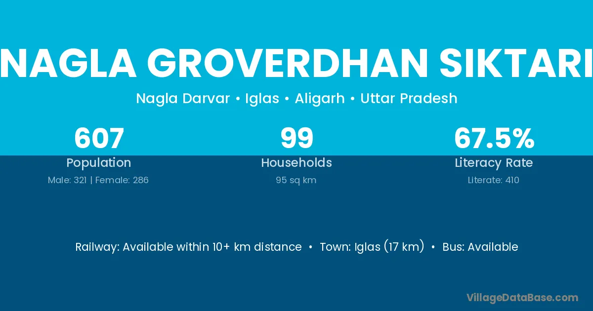 Iglas (17 km) is the nearest town to Nagla Groverdhan Siktari village for major economic activities and is located approximately 17 km away.