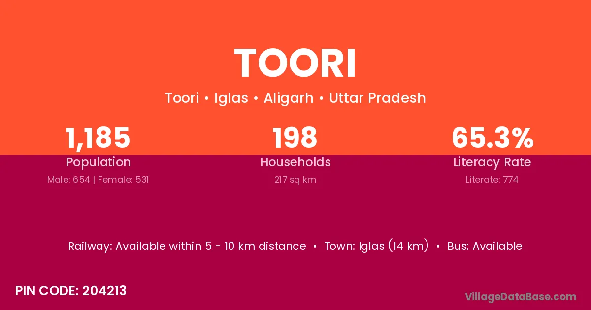 Iglas (14 km) is the nearest town to Toori village for major economic activities and is located approximately 14 km away.