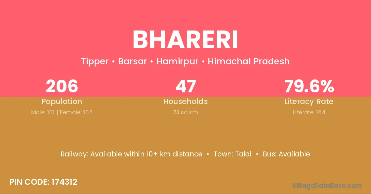 Bhareri village has a total population of 1,226 people, of which 660 are males and 566 are females.