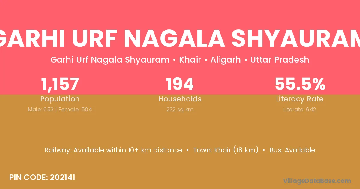 Garhi Urf Nagala Shyauram village has a total population of 1,157 people, of which 653 are males and 504 are females.