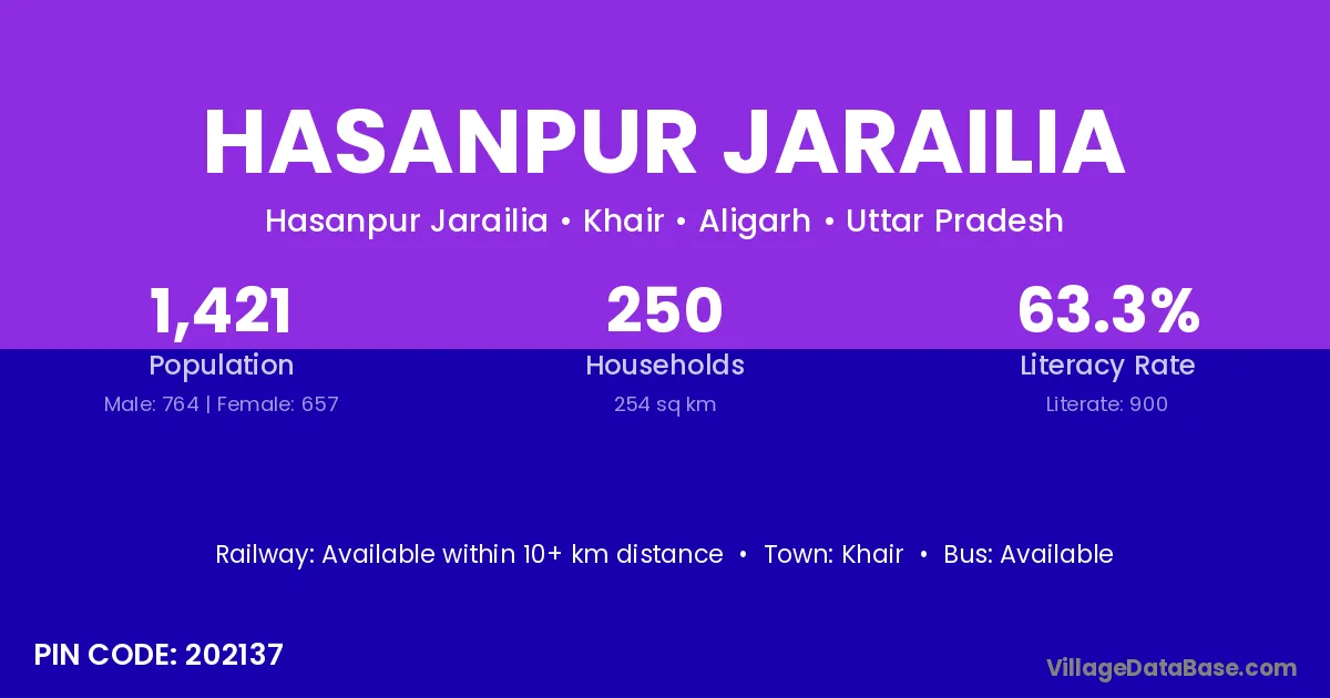 Hasanpur Jarailia village has a total population of 1,421 people, of which 764 are males and 657 are females.
