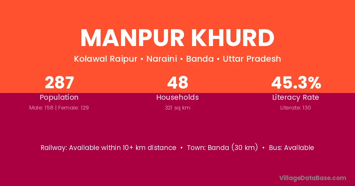 Manpur Khurd village has a total population of 1,787 people, of which 943 are males and 844 are females.