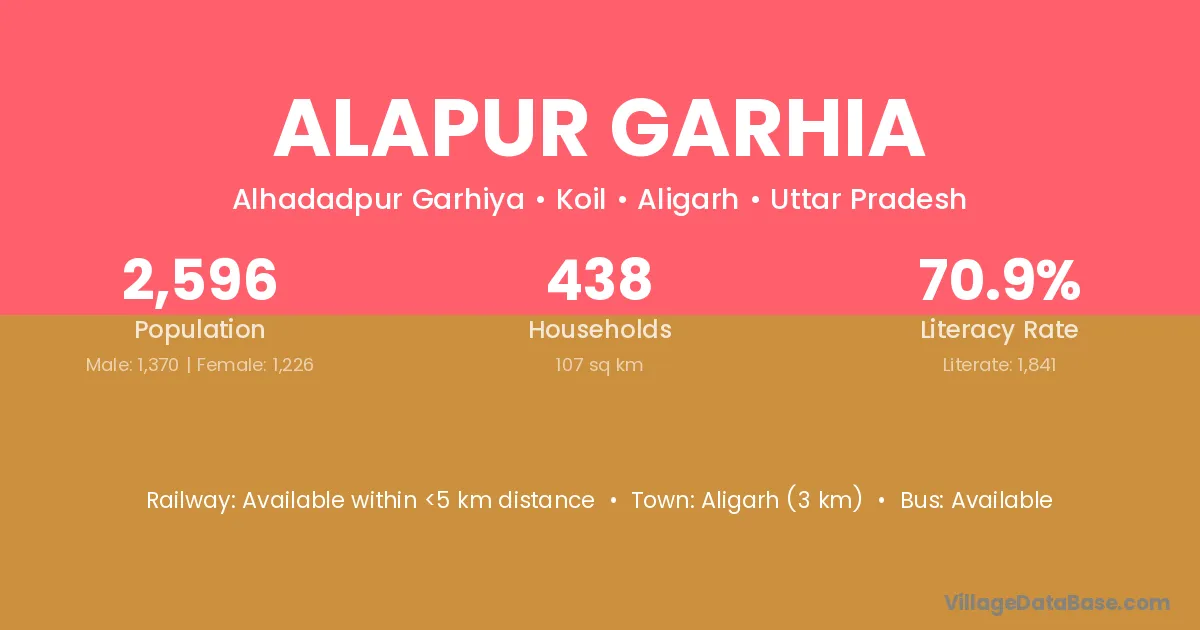 Aligarh (3 km) is the nearest town to Alapur Garhia village for major economic activities and is located approximately 3 km away.