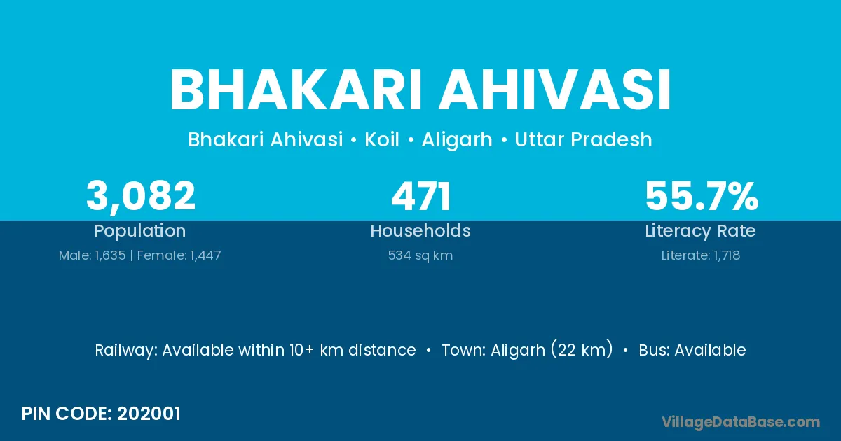 Aligarh (22 km) is the nearest town to Bhakari Ahivasi village for major economic activities and is located approximately 22 km away.