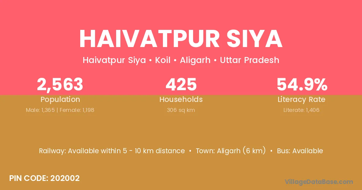 Aligarh (6 km) is the nearest town to Haivatpur Siya village for major economic activities and is located approximately 6 km away.