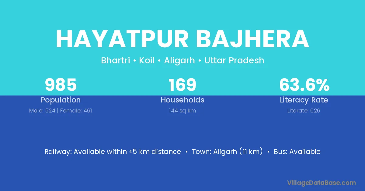 Aligarh (11 km) is the nearest town to Hayatpur Bajhera village for major economic activities and is located approximately 11 km away.
