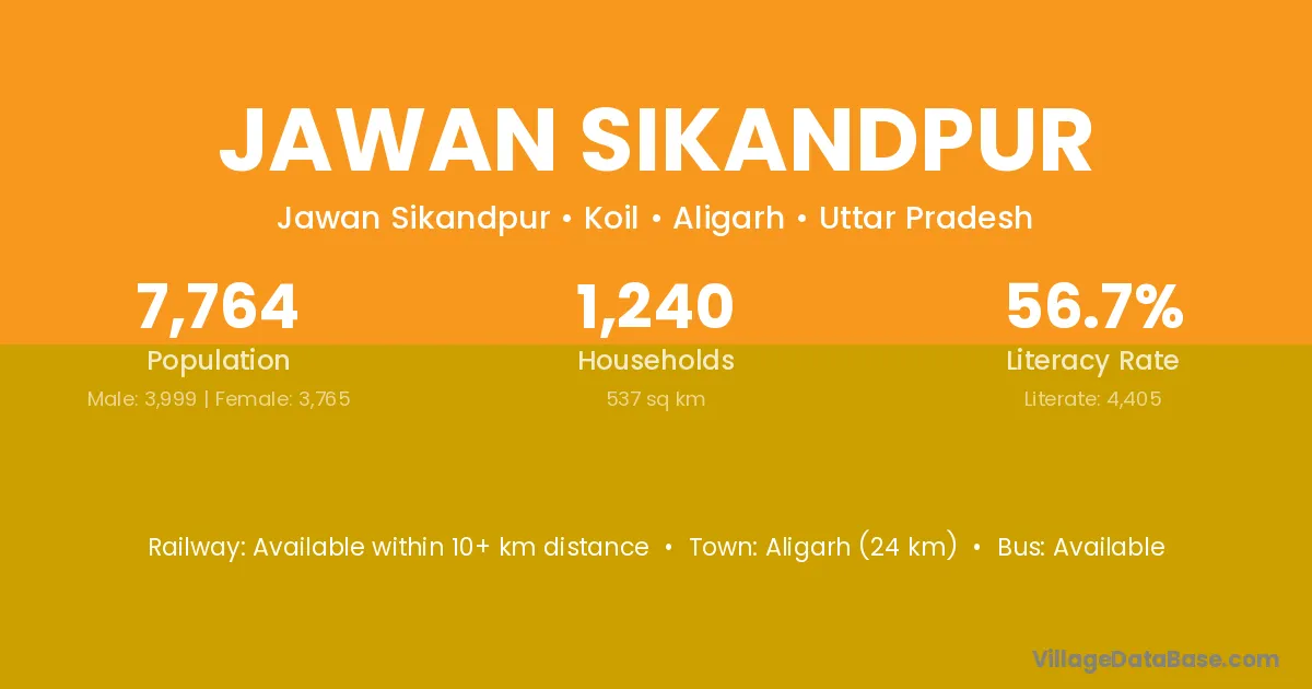 Aligarh (24 km) is the nearest town to Jawan Sikandpur village for major economic activities and is located approximately 24 km away.