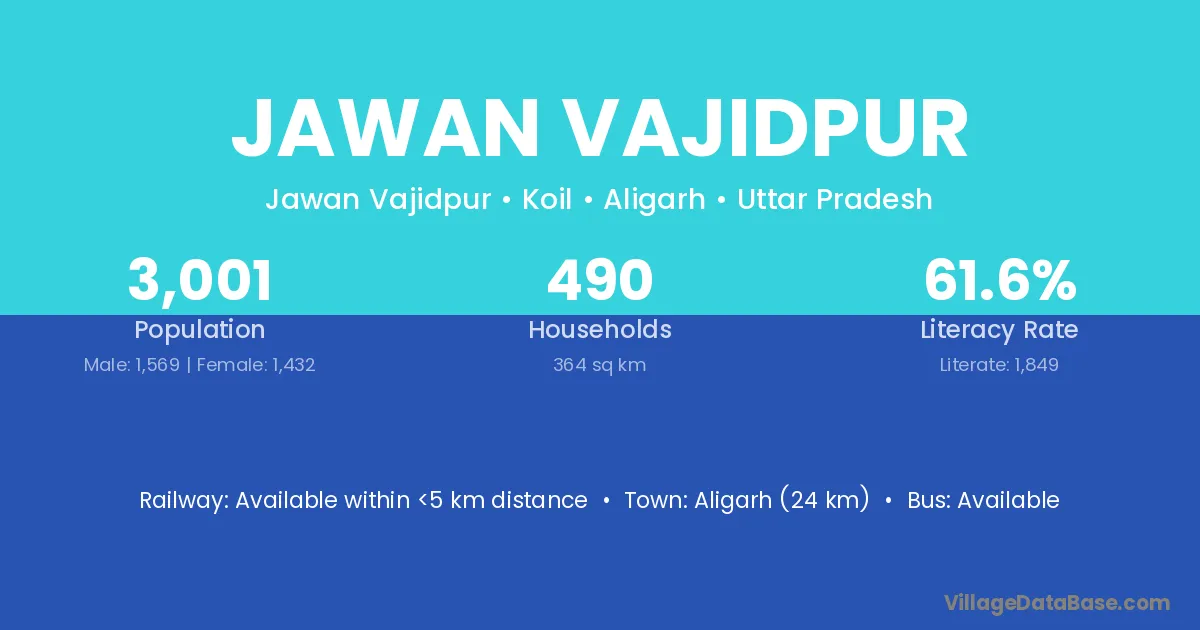 Aligarh (24 km) is the nearest town to Jawan Vajidpur village for major economic activities and is located approximately 24 km away.
