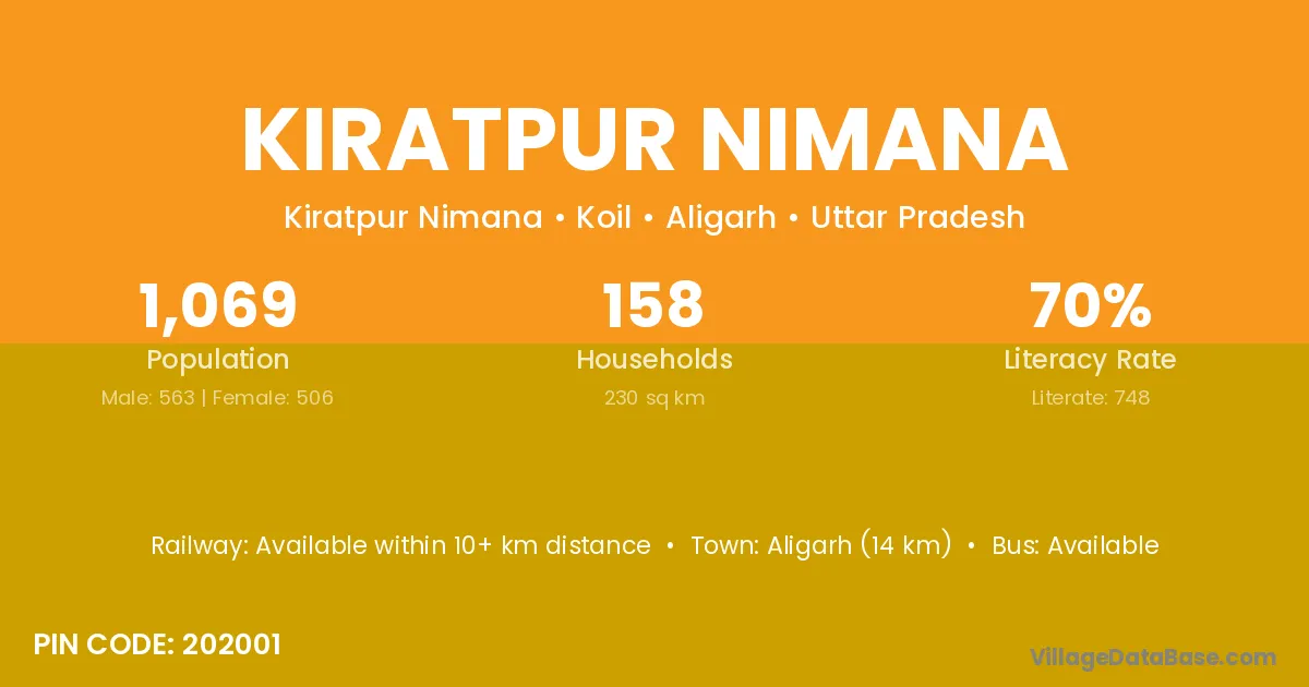 Aligarh (14 km) is the nearest town to Kiratpur Nimana village for major economic activities and is located approximately 14 km away.