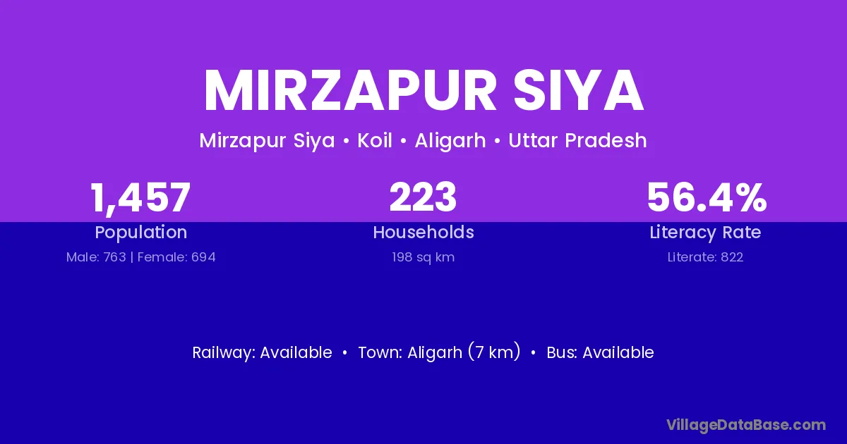 Aligarh (7 km) is the nearest town to Mirzapur Siya village for major economic activities and is located approximately 7 km away.