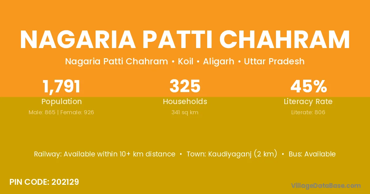 Nagaria Patti Chahram village has a total population of 1,791 people, of which 865 are males and 926 are females.