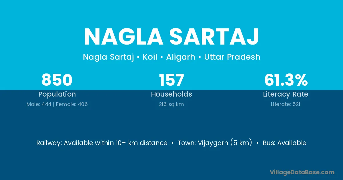 Vijaygarh (5 km) is the nearest town to Nagla Sartaj village for major economic activities and is located approximately 5 km away.