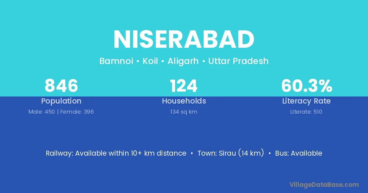 Sirau (14 km) is the nearest town to Niserabad village for major economic activities and is located approximately 14 km away.