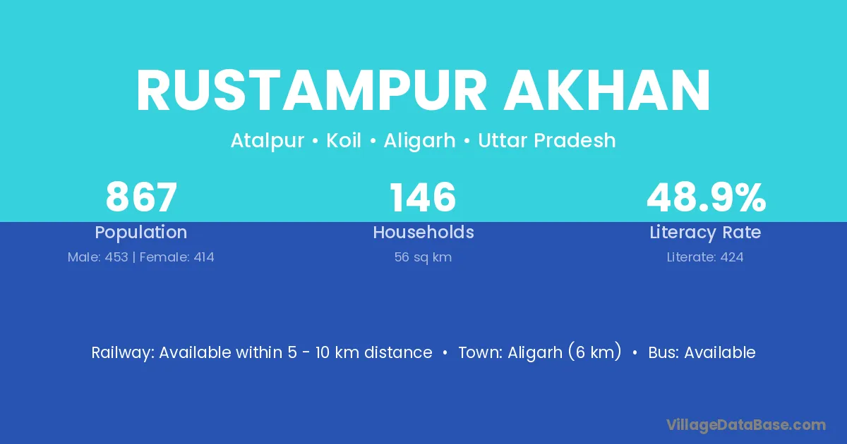 Aligarh (6 km) is the nearest town to Rustampur Akhan village for major economic activities and is located approximately 6 km away.
