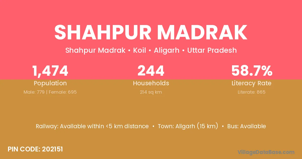 Aligarh (15 km) is the nearest town to Shahpur Madrak village for major economic activities and is located approximately 15 km away.