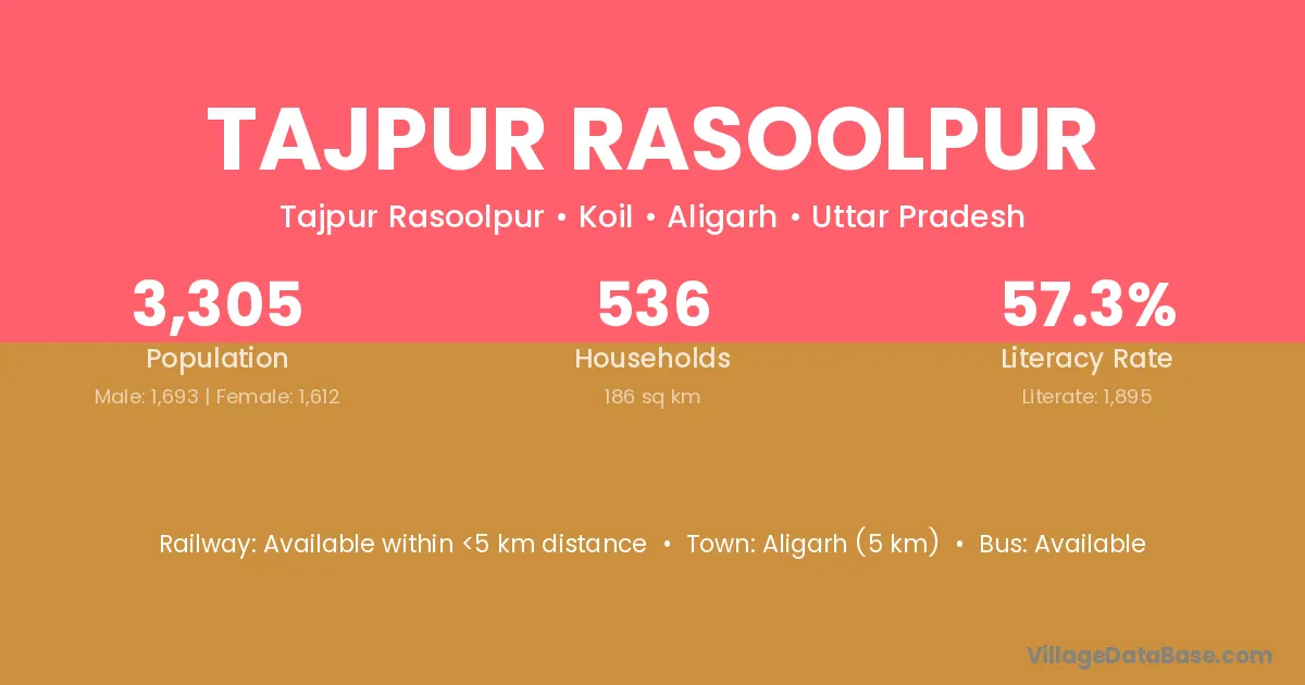 Aligarh (5 km) is the nearest town to Tajpur Rasoolpur village for major economic activities and is located approximately 5 km away.