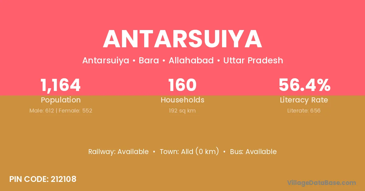 Antarsuiya village has a total population of 1,164 people, of which 612 are males and 552 are females.