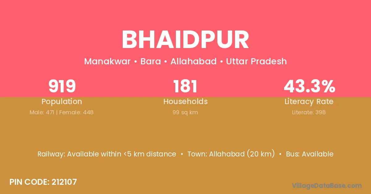 Allahabad (20 km) is the nearest town to Bhaidpur village for major economic activities and is located approximately 20 km away.