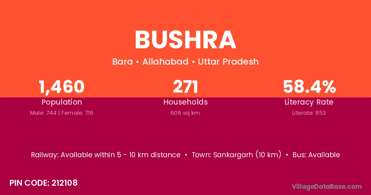 Bushra village has a total population of 1,460 people, of which 744 are males and 716 are females.