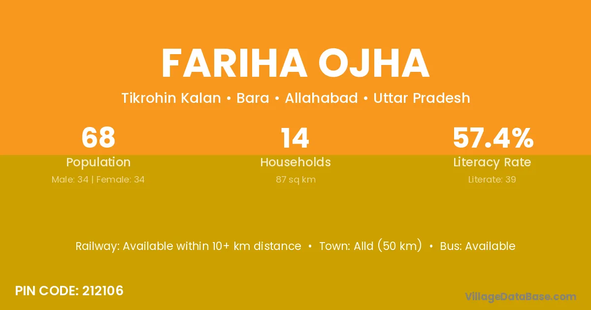 Fariha Ojha village has a total population of 68 people, of which 34 are males and 34 are females.