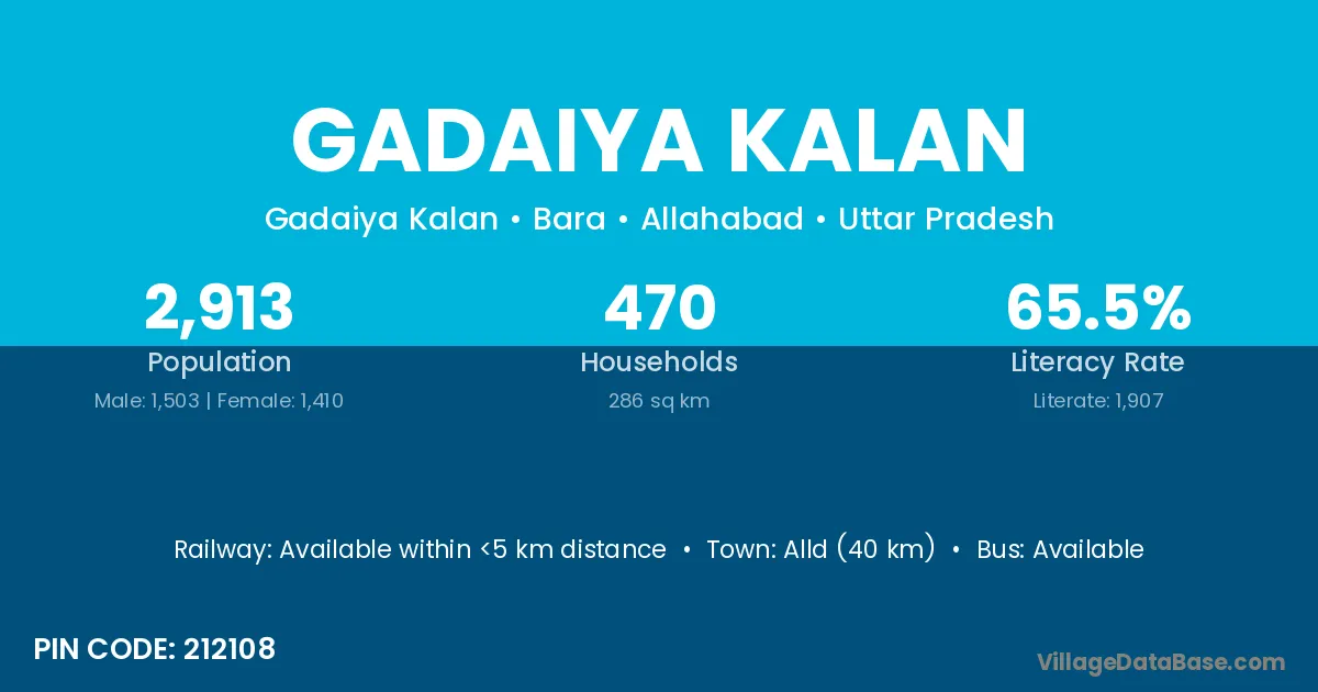 Alld (40 km) is the nearest town to Gadaiya Kalan village for major economic activities and is located approximately 40 km away.