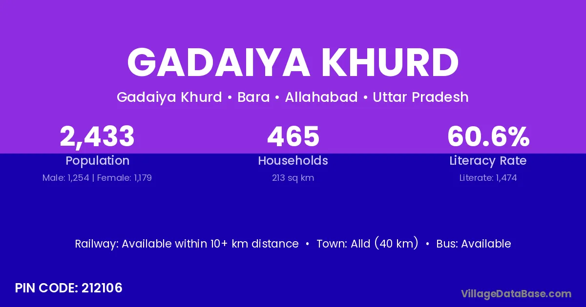 Alld (40 km) is the nearest town to Gadaiya Khurd village for major economic activities and is located approximately 40 km away.