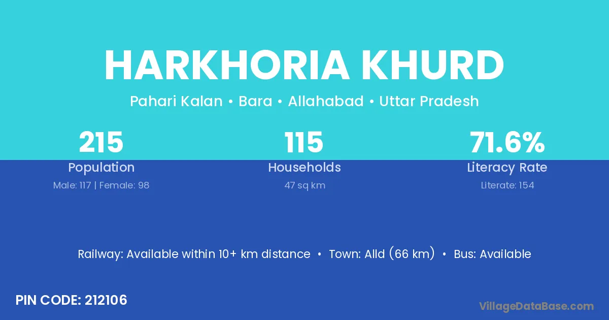 Alld (66 km) is the nearest town to Harkhoria Khurd village for major economic activities and is located approximately 66 km away.