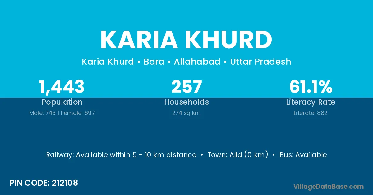 Karia Khurd village has a total population of 1,443 people, of which 746 are males and 697 are females.