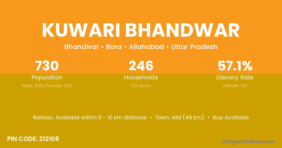 Alld (46 km) is the nearest town to Kuwari Bhandwar village for major economic activities and is located approximately 46 km away.