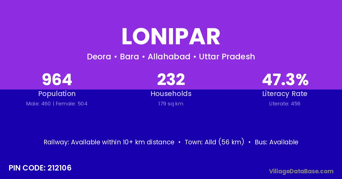 Alld (56 km) is the nearest town to Lonipar village for major economic activities and is located approximately 56 km away.