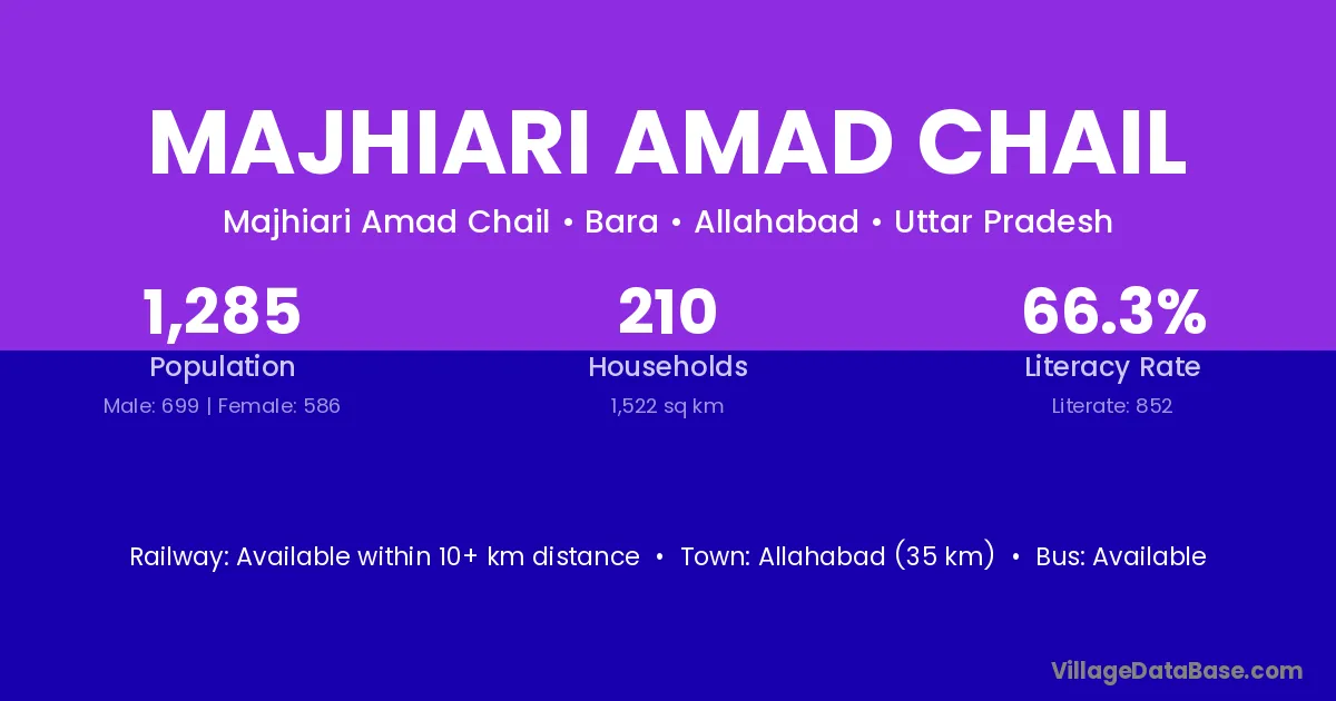 Allahabad (35 km) is the nearest town to Majhiari Amad Chail village for major economic activities and is located approximately 35 km away.