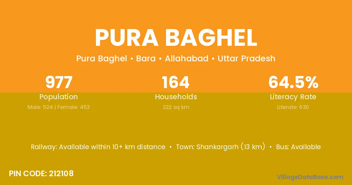 Pura Baghel village has a total population of 977 people, of which 524 are males and 453 are females.