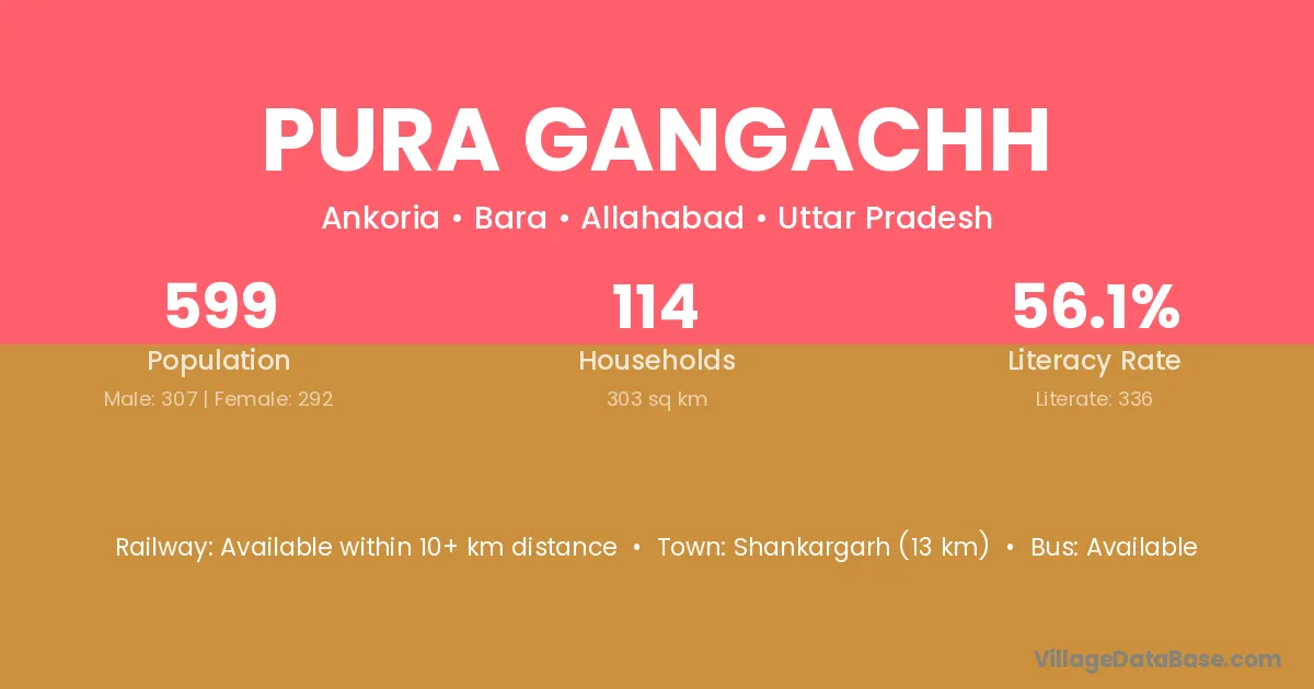 Pura Gangachh village has a total population of 599 people, of which 307 are males and 292 are females.