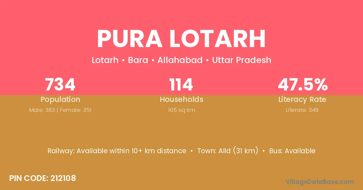 Pura Lotarh village has a total population of 734 people, of which 383 are males and 351 are females.