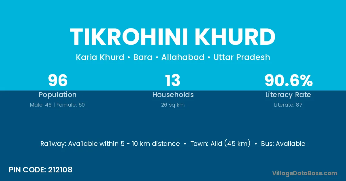 Alld (45 km) is the nearest town to Tikrohini Khurd village for major economic activities and is located approximately 45 km away.