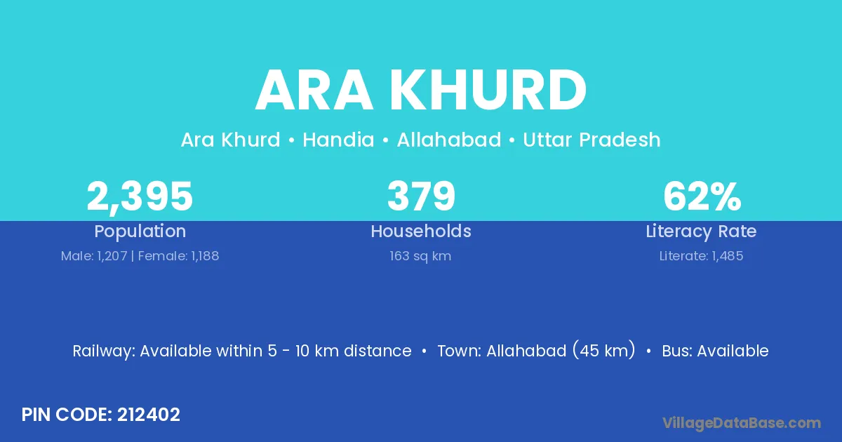 Allahabad (45 km) is the nearest town to Ara Khurd village for major economic activities and is located approximately 45 km away.