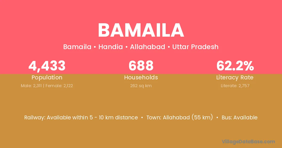Bamaila village has a total population of 4,433 people, of which 2,311 are males and 2,122 are females.