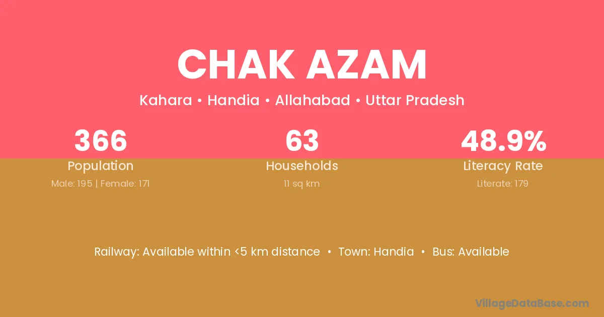 Chak Azam village has a total population of 366 people, of which 195 are males and 171 are females.