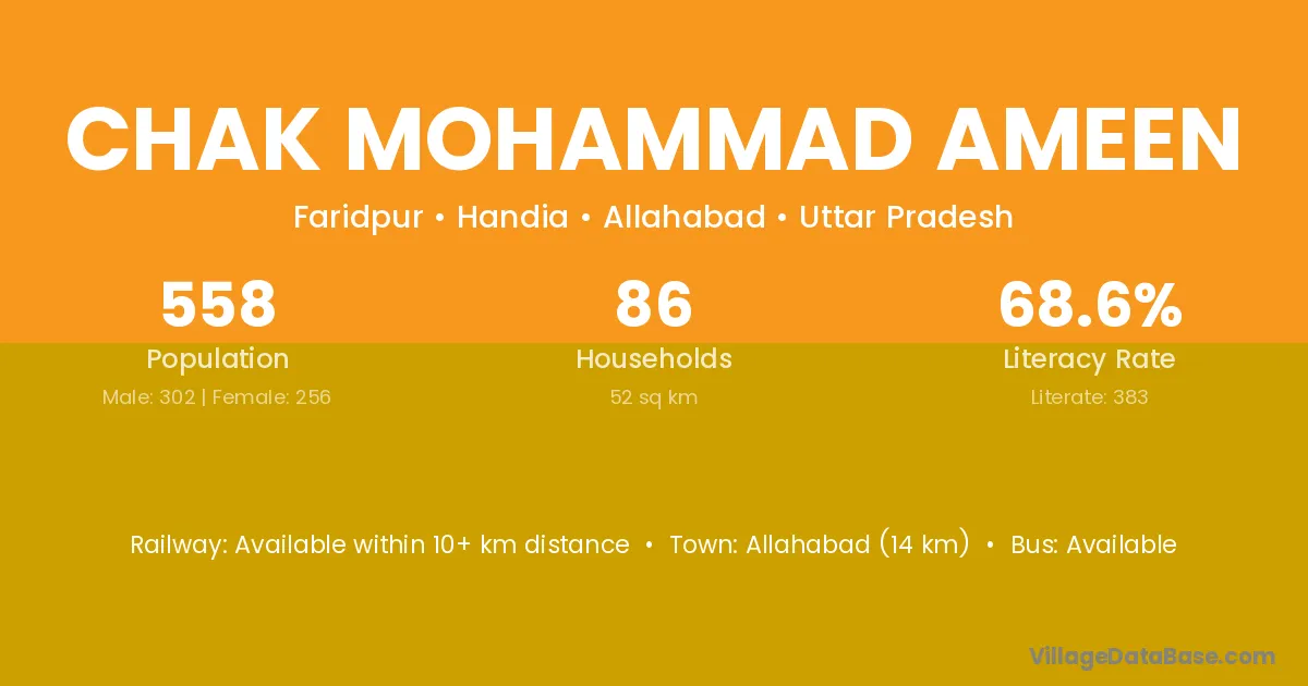 Allahabad (14 km) is the nearest town to Chak Mohammad Ameen village for major economic activities and is located approximately 14 km away.
