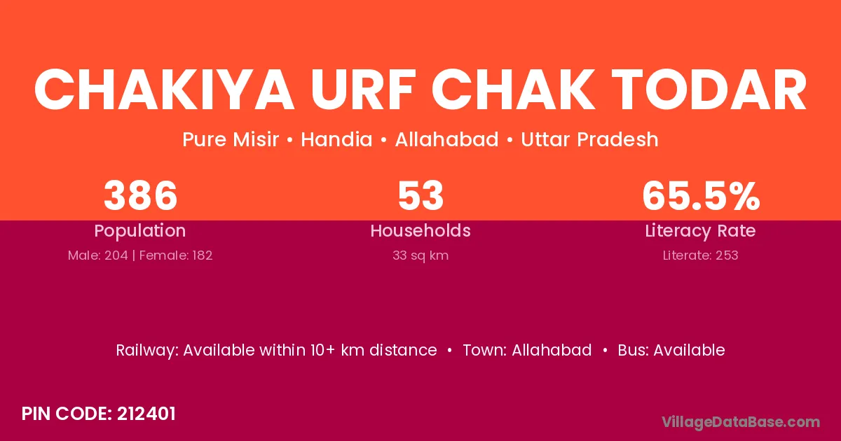 Chakiya Urf Chak Todar village has a total population of 386 people, of which 204 are males and 182 are females.