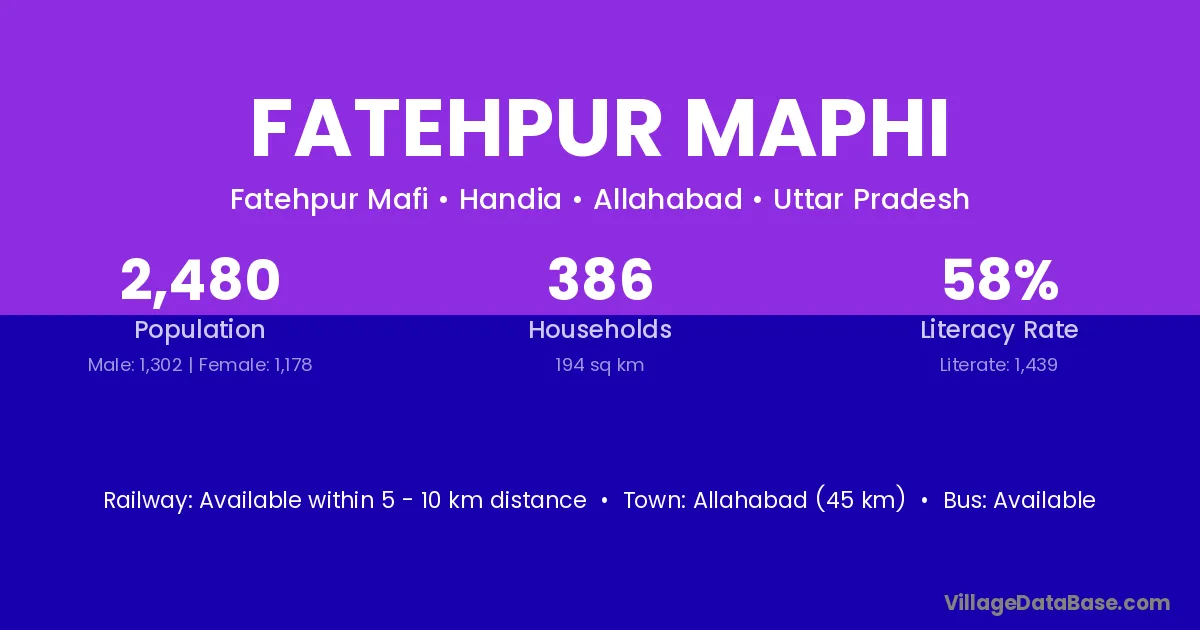 Allahabad (45 km) is the nearest town to Fatehpur Maphi village for major economic activities and is located approximately 45 km away.