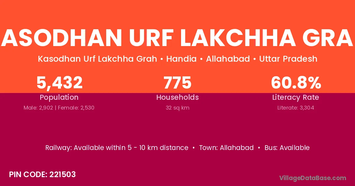 Kasodhan Urf Lakchha Grah village has a total population of 5,432 people, of which 2,902 are males and 2,530 are females.