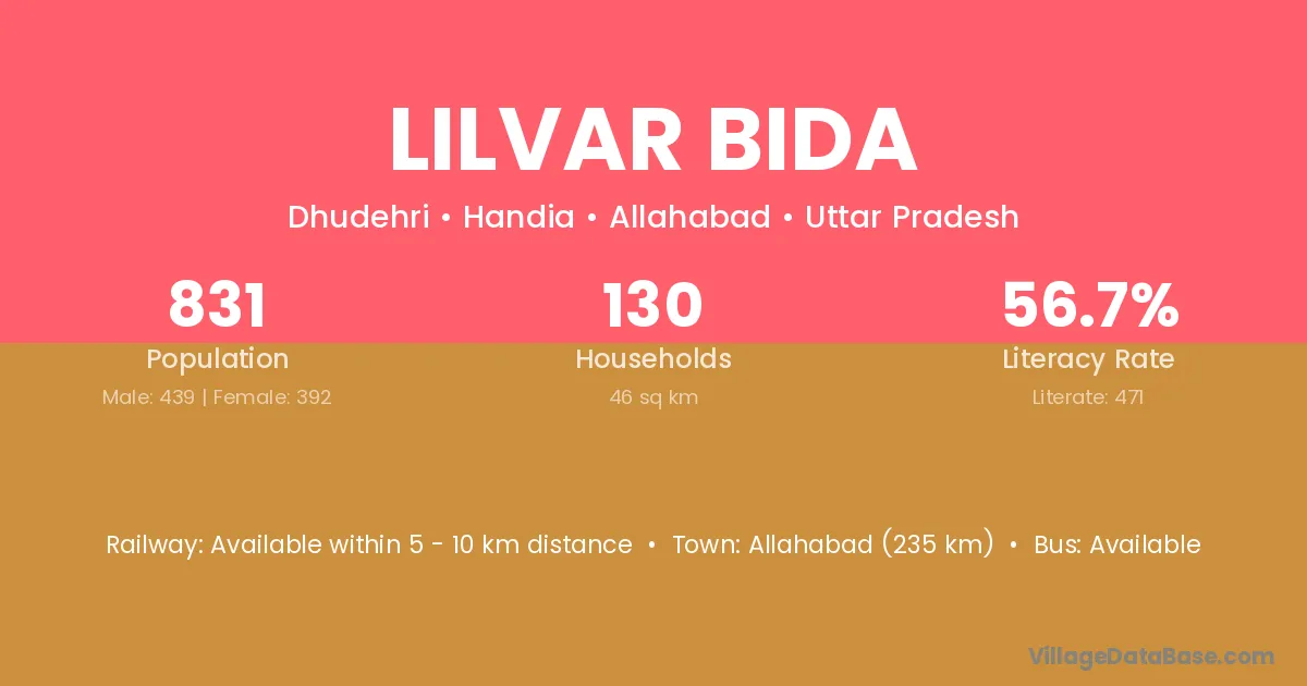 Allahabad (235 km) is the nearest town to Lilvar Bida village for major economic activities and is located approximately 235 km away.