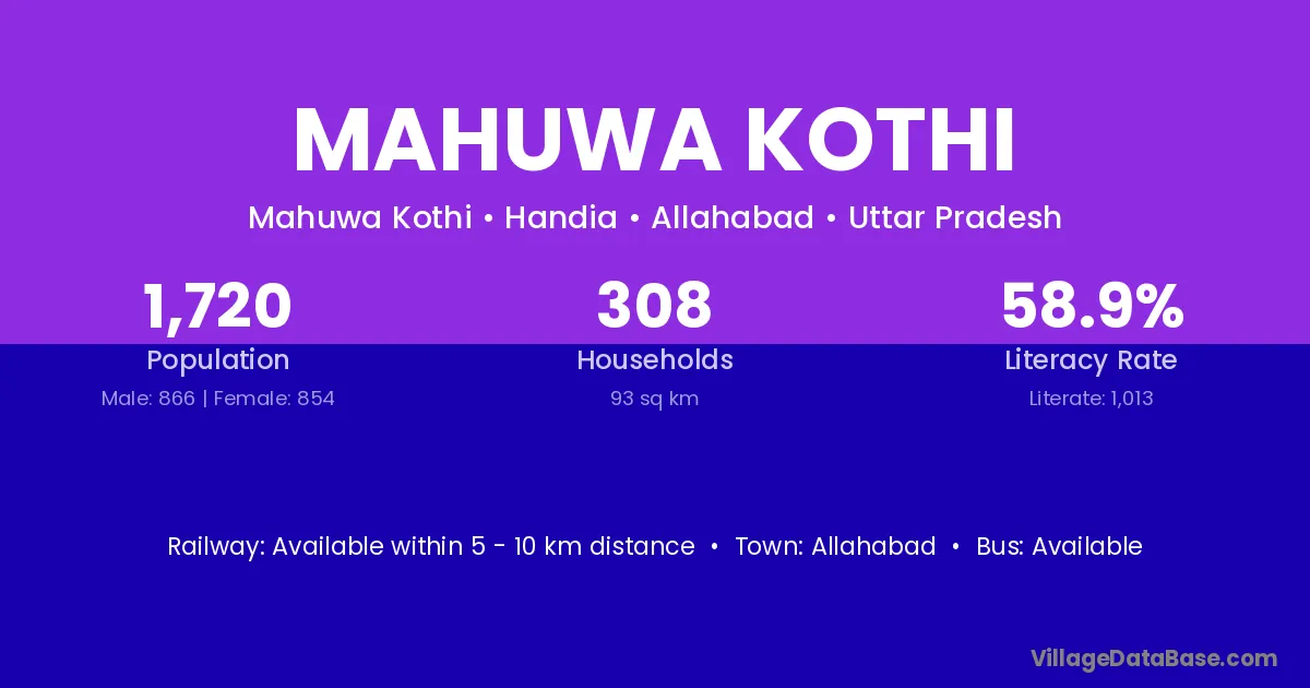 Mahuwa Kothi village has a total population of 1,720 people, of which 866 are males and 854 are females.