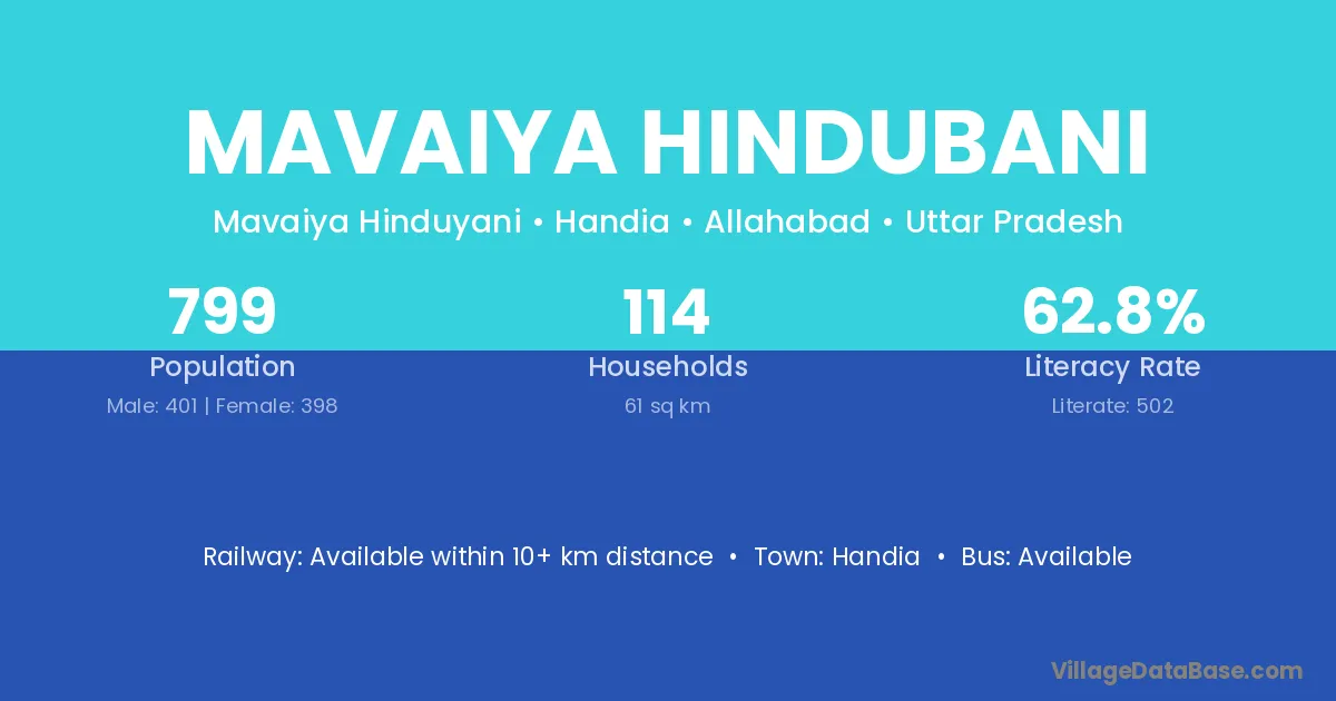 Mavaiya Hindubani village has a total population of 799 people, of which 401 are males and 398 are females.
